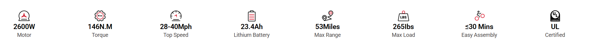 The 48V/23.4AH lithium battery offers a range of 35–53 miles (56–85 km) depending on load, terrain, speed, and temperature.